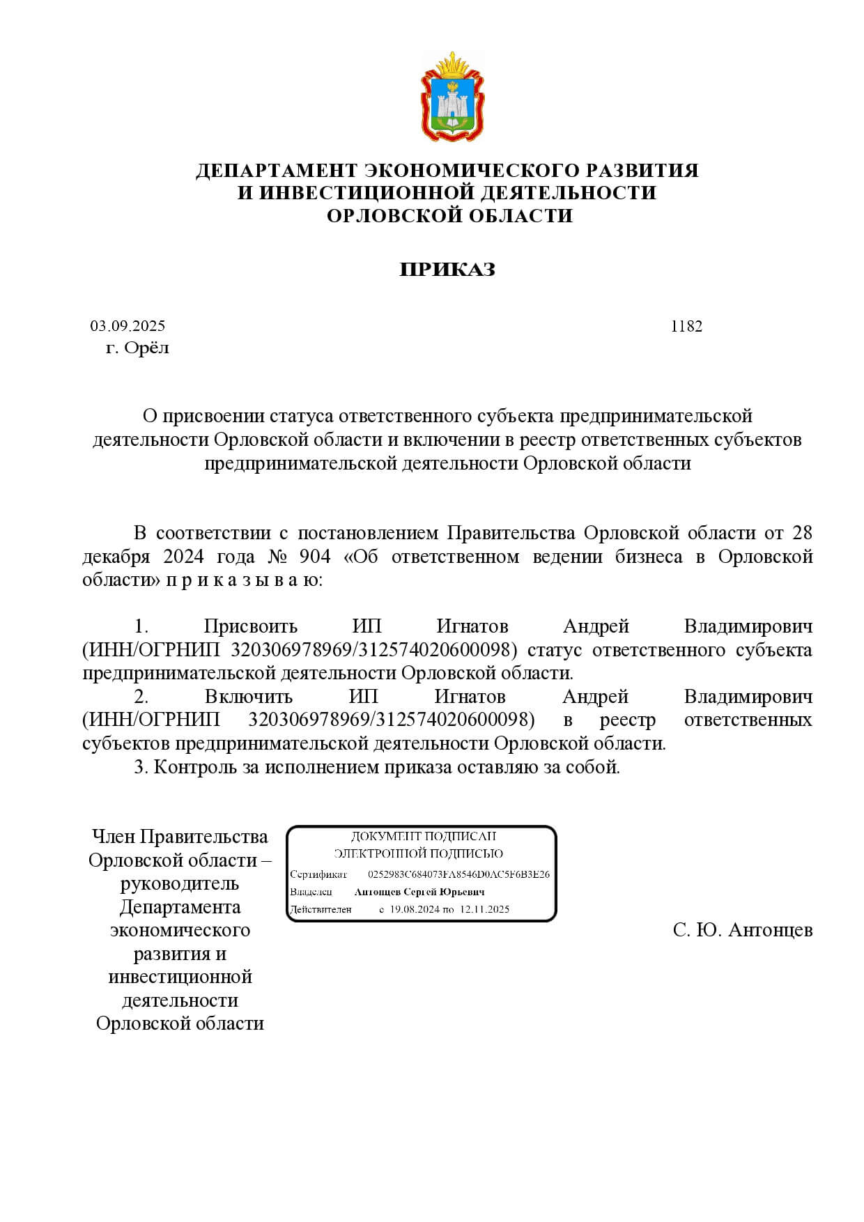 Статус ответственного субъекта предпринимательской деятельности Орловской области